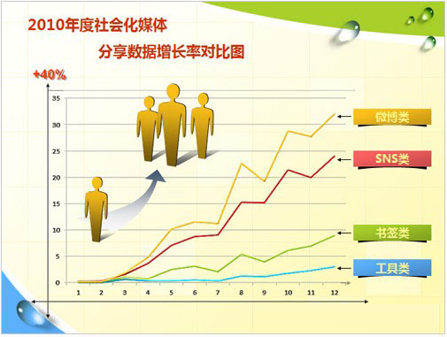 將2010年各類(lèi)型媒體每月分享數據匯總,我們發(fā)現微博類(lèi)發(fā)展迅猛,增速排名第一。
