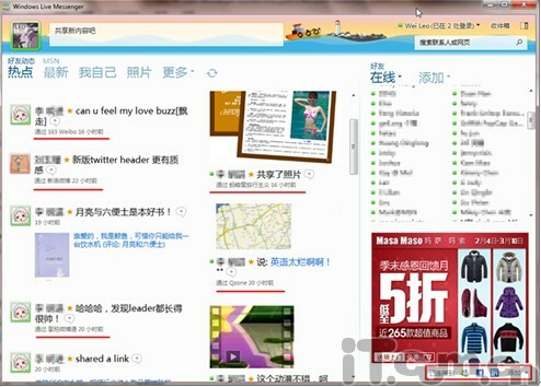 目前,使用Windows Live Messenger 2011的用戶(hù)可以在“社交面版”或“簽名狀態(tài)”看到好友通過(guò)MSN連接綁定Windows Live Messenger后發(fā)布在新浪微博或其他社交網(wǎng)站的信息。