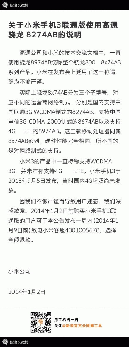 1月2日消息,針對網(wǎng)友有關(guān)小米手機3聯(lián)通版偷換CPU的質(zhì)疑,小米公司今天下午發(fā)布微博向用戶(hù)致歉,稱(chēng)小米與高通一直使用驍龍8974AB統稱(chēng)整個(gè)驍龍800 8x74AB系列產(chǎn)品,措辭上不夠嚴謹,并接受2014年1月2日前購買(mǎi)小米手機3聯(lián)通版用戶(hù)的全額退款。