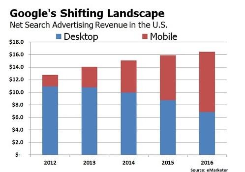 eMarketer預計,今年美國市場(chǎng)臺式電腦搜索營(yíng)收會(huì )加速下滑,將從去年的108億美元,降至今年的100億美元;但是,今年的美國市場(chǎng)移動(dòng)搜索營(yíng)收,將從2013年的33億美元,增至51億美元。