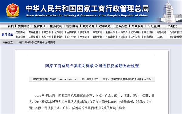 今天,國家工商總局在官網(wǎng)宣布,已對微軟公司涉嫌壟斷行為立案調查。2014年7月28日,國家工商總局組織由北京、上海、廣東、四川、福建、湖北、江蘇、重慶、河北等9省市近百名工商執法人員對微軟公司在中國大陸的四個(gè)經(jīng)營(yíng)場(chǎng)所,即微軟(中國)有限公司以及上海、廣州、成都的分公司同時(shí)進(jìn)行反壟斷突擊檢查。