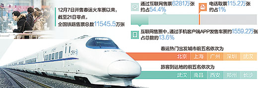 此外,12月12日上線(xiàn)的手機客戶(hù)端2.0版改善了用戶(hù)購票體驗,簡(jiǎn)化了購票操作,同時(shí)優(yōu)化了網(wǎng)站購票流程。據介紹,春運火車(chē)票開(kāi)售以來(lái),手機客戶(hù)端發(fā)售車(chē)票占比13.6%,12306網(wǎng)站占比40.9%。