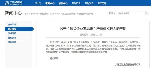 11月14日萬(wàn)達集團官網(wǎng)發(fā)表聲明:王健林從未發(fā)表過(guò)與此相關(guān)的任何言論,該文冒用王健林先生名義,嚴重誤導讀者,侵害王健林先生的名譽(yù)權,萬(wàn)達集團將采取法律手段維護自身權益。