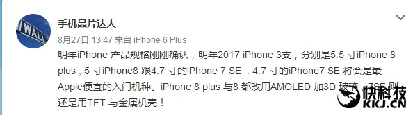 此外,消息人士還強調,2017年的iPhone將有三款,一個(gè)是5.5寸的iPhone 8 Plus,一個(gè)是5寸iPhone 8,至于4.7寸的iPhone SE將成為蘋(píng)果便宜的入門(mén)機型,其會(huì )使用TFT材質(zhì)屏幕和金屬外殼,而iPhone 8系列將是AMOLED屏幕,機身為雙面3D玻璃。
